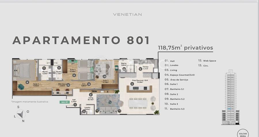 Apartamento com 118,75m² de área privativa, 03 suítes, churrasqueira à carvão e 2 vagas de garagem.