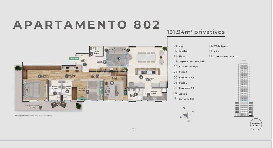 Apartamento com 131,94m² de área privativa, terraço privativo, 03 suítes, churrasqueira à carvão e 2 vagas de garagem.